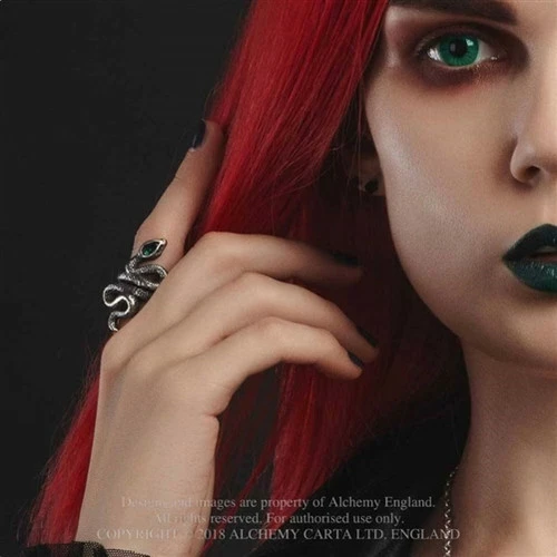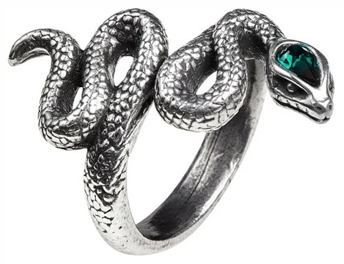 An easily adjustable pewter ring of a coiled serpent, with a green Swarovski crystal set into its head.
