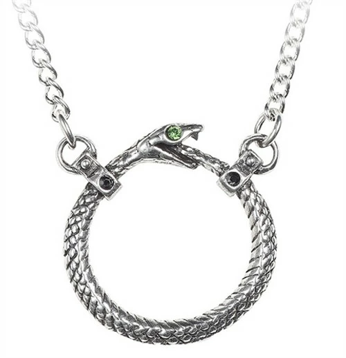 A pewter serpent eternity ring pendant with a green Swarovski crystal eye.
