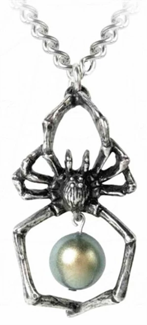 An antiqued pewter pendant of a spider with a suspended dark pearl body; on a 53cm trace chain