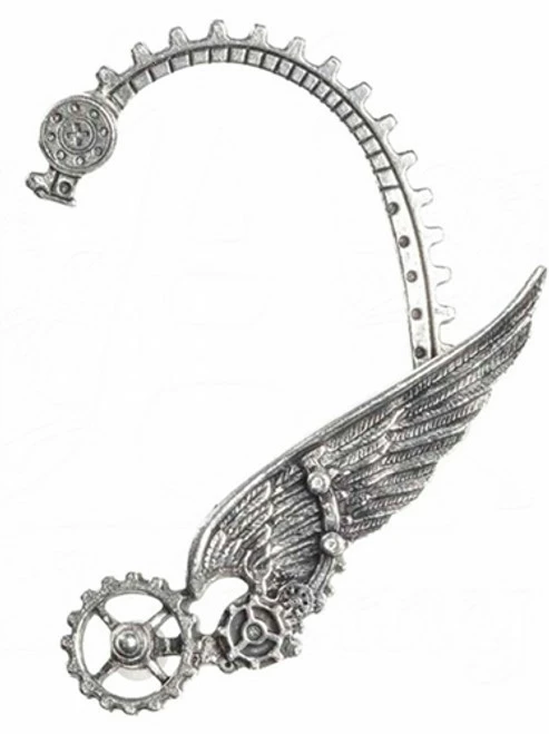 An antiqued pewter ear-wrap of a feathered wing supported by vintage mechanical engineering including cogs and gear rack – can be gently squeezed to comfortably fit your own profile; fastened at the lobe with one surgical steel ear-post.
