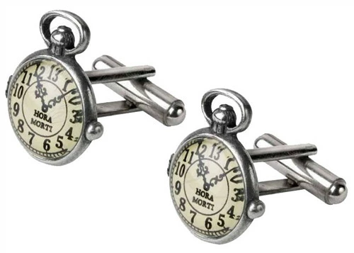 A pair of pewter cuff links of a Victorian pocket watch with a printed and enamelled 13-hour watch face; with swivel bar fittings.
