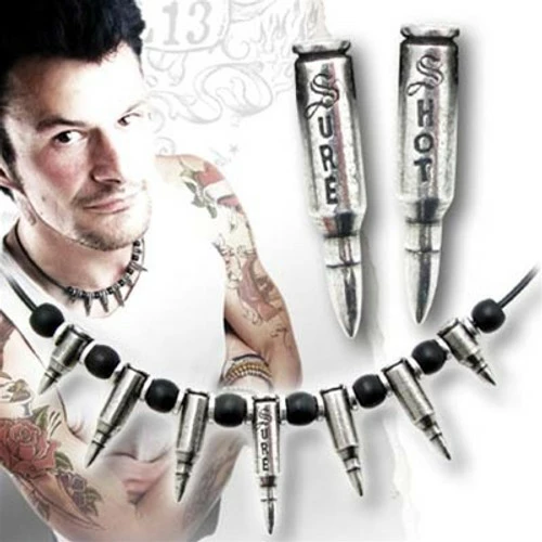 Sure Shot Pewter bullets & wooden beads trophy necklace on leather cord. Central bullet is etched both sides with the “Sure Shot” legend & end caps are also etched with UL13 logo.