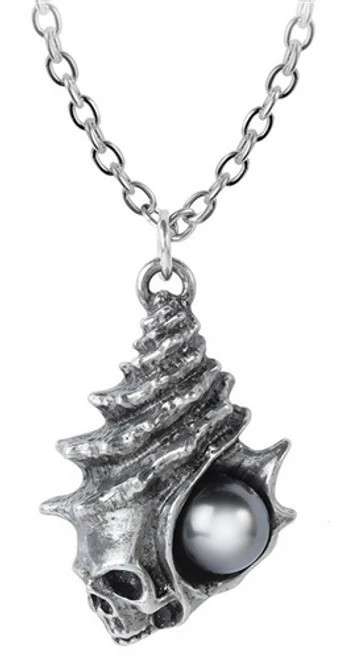 A pewter conch shell bearing human skull features, and set with a 10mm Swarovski graphite coloured pearl.