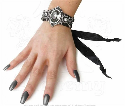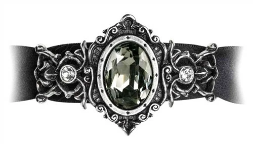 An intricate, antiqued polished pewter, 18th century Baroque-style bracelet front, set with a large, Swarovski black diamond crystal at its centre, and two small white crystals either side. On a 22″/55 cm long, 24 mm wide black satin ribbon, with sliding pewter bead fastener.