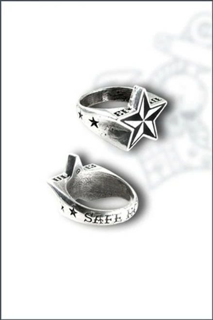 Black enamelled Nautical Star with engraved “Safe Home” legend.