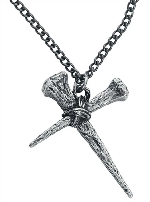 Resurrection Pendant by Alchemy, an obliquely hung pewter cross pendant formed by two primitive iron nails bound as a cruciform.